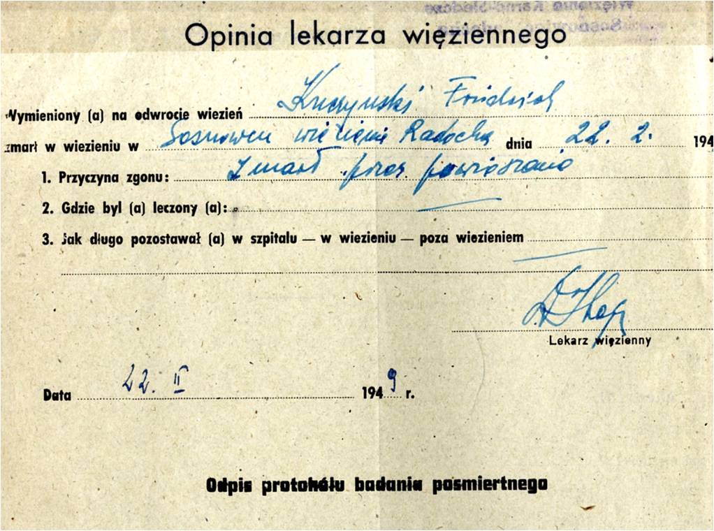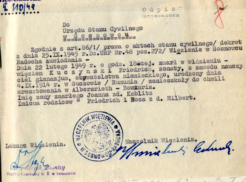 W godzinach wieczornych 22 lutego 1949 r., na podwórzu więziennym – w obecności naczelnika tego więzienia w Sosnowcu, protokolanta, lekarza i księdza – podprokurator Z. Jarocki odczytał Friedrichowi Kuczyńskiemu sentencję wyroku i oznajmił skazanemu, że Prezydent Rzeczypospolitej Polskiej nie skorzystał z przysługującego mu prawa łaski. Wyrok śmierci wykonano przez powieszenie, a zwłoki tego nazistowskiego zbrodniarza, którego stracono w wieku 34 lat, zostały pogrzebane na cmentarzu Nowosieleckim w Sosnowcu.