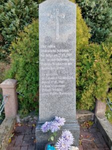 Nagrobek był pierwotnie tylko w formie kamienia piaskowego, później powstało upamiętnienie, które widoczne jest na powyższym zdjęciu. Sądząc po wyglądzie to wydaje się, że płyta ta i nagrobek musiały powstać całkiem niedawno.