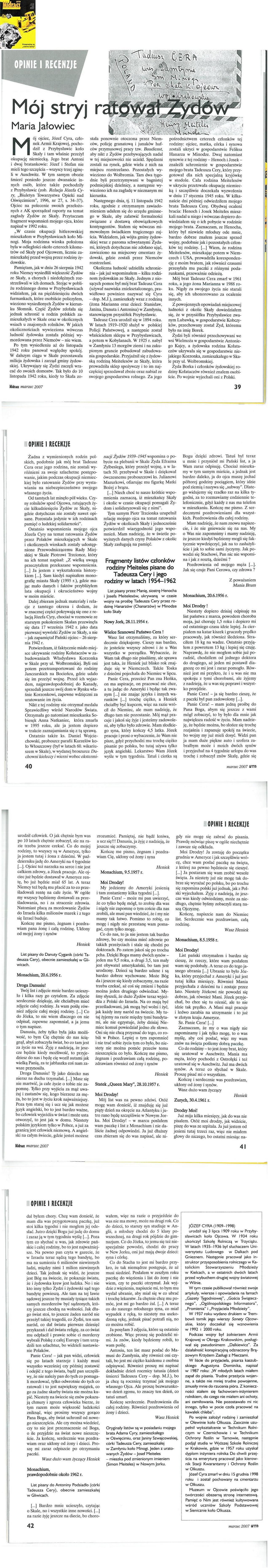 Brat mojego ojca Tadeusz Cera był moim ojcem chrzestnym. Z okazji Narodowego Dnia Pamięci o Polakach ratujących Żydów, który obchodzony jest od ubiegłego roku w Polsce 24 marca, chciałem przypomnieć jego postać. Tekst poniższy napisałem na podstawie wspomnień mojego ojca Józefa Cyry, który na polecenie swoich przełożonych z Armii Krajowej, sporządził raport na temat zagłady Żydów ze Skały, której prawie że był naocznym świadkiem.
