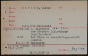 W maju 1944 r. władze obozowe zwolniły Düninga z KL Auschwitz, kierując go do brygady SS-Oberführera Oskara Dirlewangera (służyli w niej również więźniowie kryminaliści — Niemcy, przeniesieni w tym celu także z obozu Auschwitz). Po kilku tygodniach, 7 lipca tegoż roku, Walter Düning został wzięty na froncie wschodnim do niewoli przez żołnierzy Armii Czerwonej, w której przebywał aż do 13 października 1955 r.