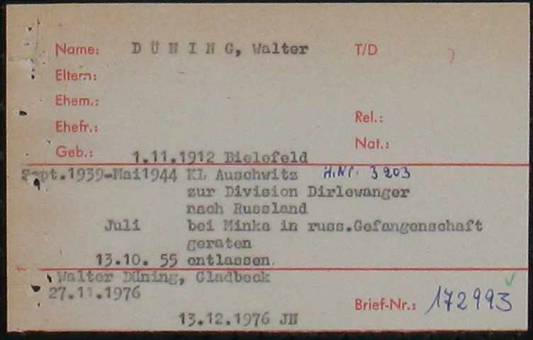 W maju 1944 r. władze obozowe zwolniły Düninga z KL Auschwitz, kierując go do brygady SS-Oberführera Oskara Dirlewangera (służyli w niej również więźniowie kryminaliści — Niemcy, przeniesieni w tym celu także z obozu Auschwitz). Po kilku tygodniach, 7 lipca tegoż roku, Walter Düning został wzięty na froncie wschodnim do niewoli przez żołnierzy Armii Czerwonej, w której przebywał aż do 13 października 1955 r.